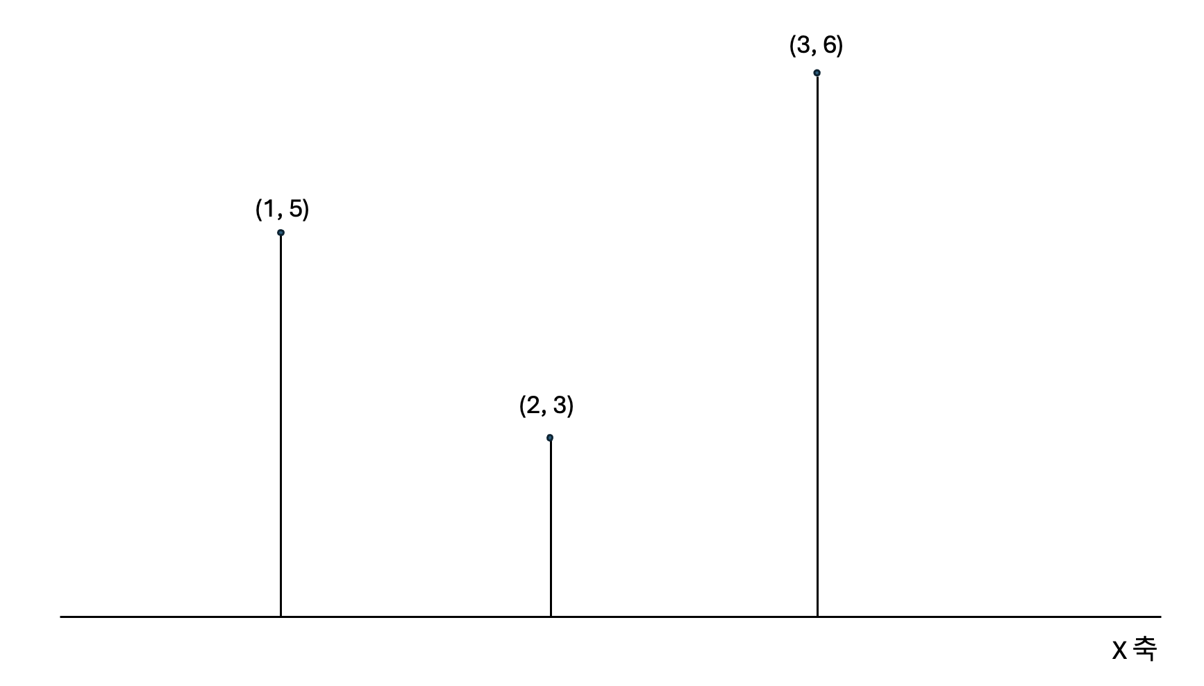 건물의 지붕위를 (x, y) 형태의 좌표 형태로 나타낼 수가 있고 좌표의 기울기 크기 비교를 통해서 바라볼 수 있는 건물의 개수를 세는 방식으로 문제를 해결하였습니다. 개수를 셀 때 오른쪽 영역과 왼쪽 영역을 따로 나눠서 생각하였습니다. 예시로 다음과 같은 세 가지 건물이 위치한다고 가정하겠습니다.