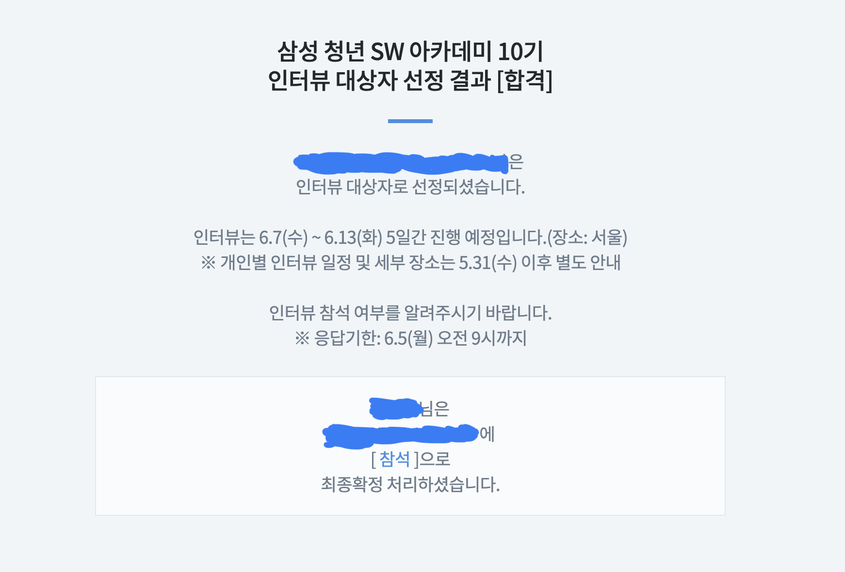 다행이 합격 통보를 받았습니다. 처음에는 에세이 때문에 걱정을 했지만 코딩 테스트와 면접 준비를 잘 마친 덕분에 합격할 수 있었던 것 같습니다.