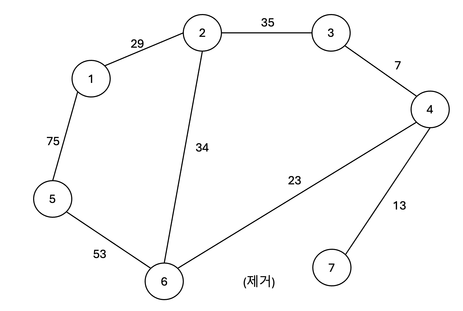 1️⃣ 비용들 중에서 가장 작은 비용을 가진 간선을 우선적으로 선택합니다. 노드 3과 4의 비용은 7이므로 이 둘에 대해서 집합에 포함시킵니다. 그래프의 변화는 없습니다.