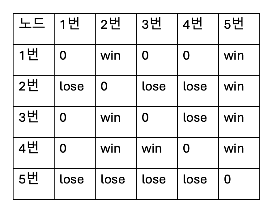 그림에서 각 행에 있는 노드가 모든 열의 노드에서의 승패 결과를 나타내면 위 그림과 같습니다.
