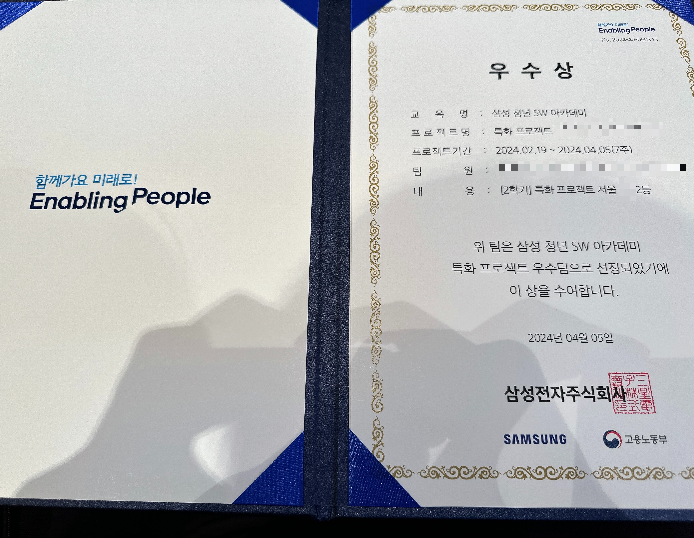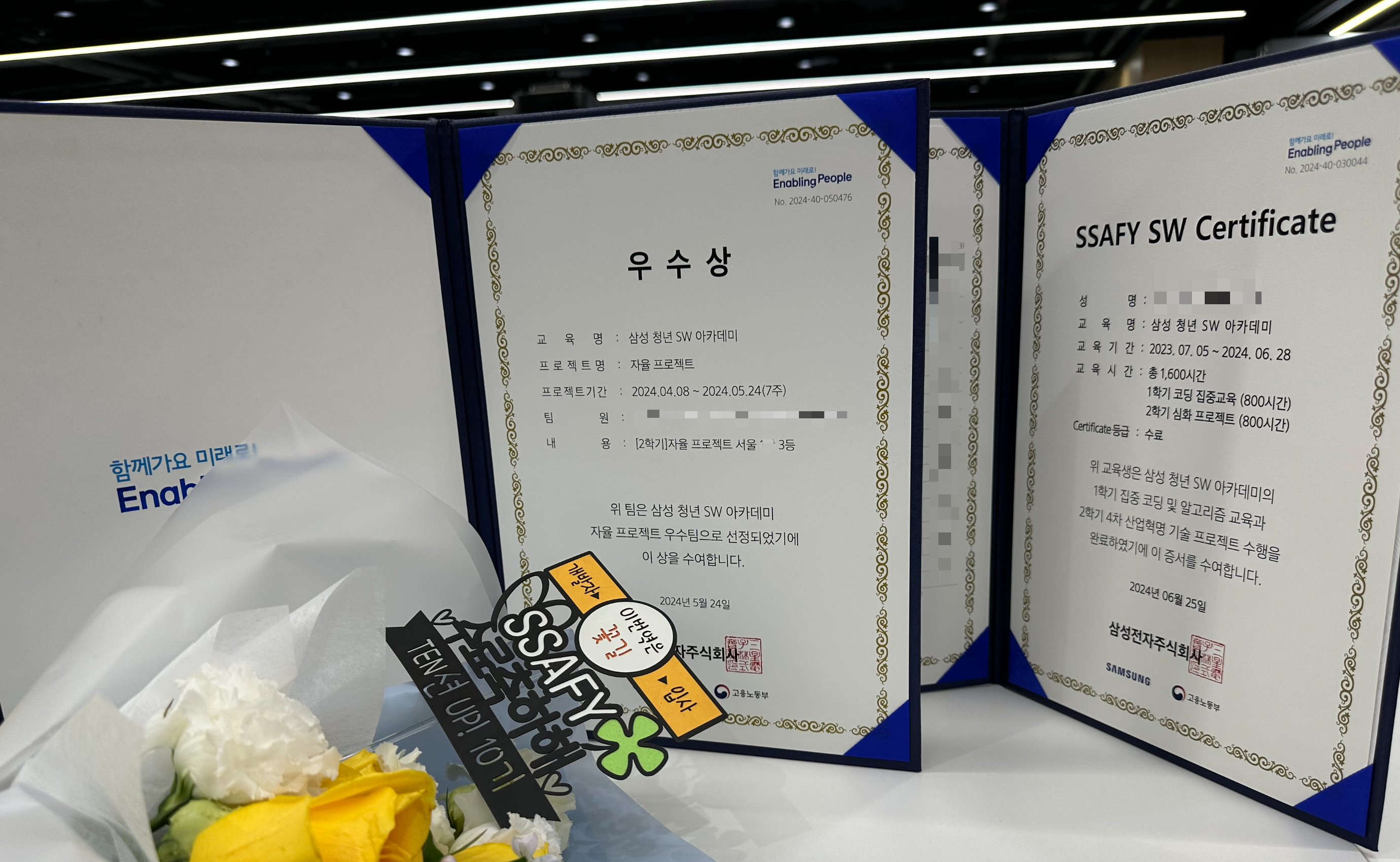 중간에 취업하면서 싸탈(싸피 탈출)이 목표였지만 지원하는 곳마다 전부 떨어져서 결국은 2학기까지 이렇게 수료를 하게 되었습니다. 하지만 프로젝트를 통해서도 다양한 팀원들과 프로젝트를 진행하며 좋은 경험들을 얻을 수 있었습니다. 이렇게 상도 받으면서 좋은 경험도 얻었구요 ㅋㅋㅋ 그럼 2학기 동안 제가 겪은 이야기들을 간단하게 들려드리겠습니다. 싸피에 관심있는 분들은 아래 링크를 참고해주세요!