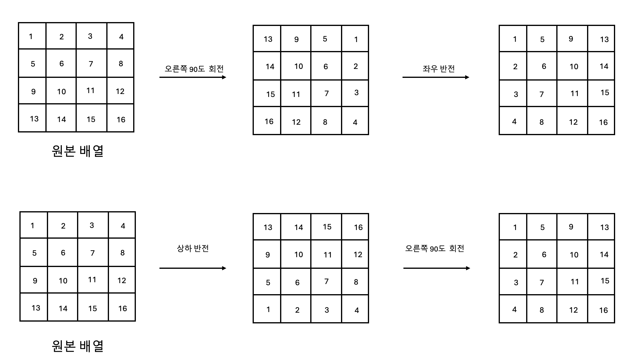 이 원리를 활용하여 그림에서 첫 번째의 연산의 순서(오른쪽 90도 회전 후 좌우 반전)가 적용이 되었다고 가정한다면 turn 변수에는 1(오른쪽 한 번 회전했다는 얘기가 된다)이 적용이 되었으므로 행과 열이 뒤바뀐 상태가 됩니다. 행과 열이 반전이 된 상태이기 때문에 좌우 반전 시 colFlip 변수가 아닌 rowFlip 변수를 true로 설정을 진행해줌으로써 상태를 저장해줍니다. 그렇게 연산을 통해서 변수들에 최종 내용들이 반영이 되었을텐데 최종적으로 살펴볼 때는 상하 또는 좌우 반전 여부를 먼저 살펴준 다음에 turn 수만큼 오른쪽 90도 회전을 진행합니다. 즉, 그림에서 두 번째 부분에 속합니다.