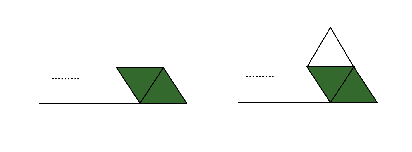 그림 2의 오른쪽 그림의 경우는 앞의 두 정삼각형이 마름모로 묶여 있는 경우입니다. 이 경우에서 점화식을 세울 때 헷갈릴 수도 있겠지만 자세히 생각하면 이 경우의 수는 그 이전 인덱스의 맨 오른쪽 정삼각형(즉 오른쪽 그림에서 맨 왼쪽 삼각형)이 마름모로 묶여 있지 않는 경우의 수와 같습니다.