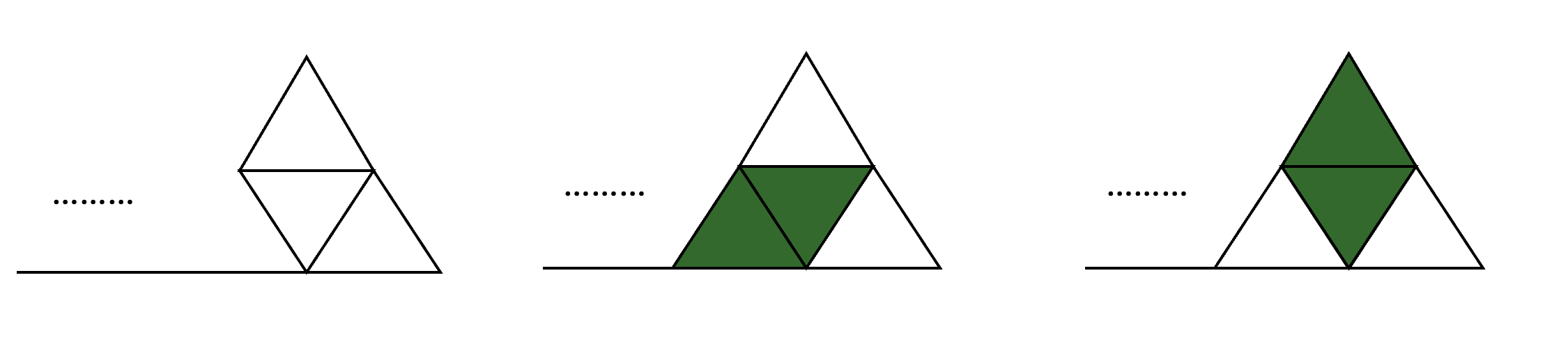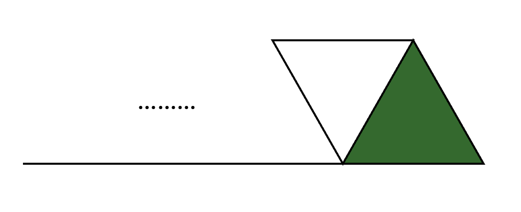 오른쪽 그림에서 그 이전 인덱스의 정삼각형만을 기준으로 그림을 다시 가져왔을 때의 상황입니다. 여기서 맨 오른쪽 정삼각형 하나만 단순히 칠해진 상황이고, 그 앞의 정삼각형과 마름모로 이어질 일이 없기에 이는 마름모로 묶여 있지 않았을 때의 타일의 경우와 같음을 알 수가 있습니다.