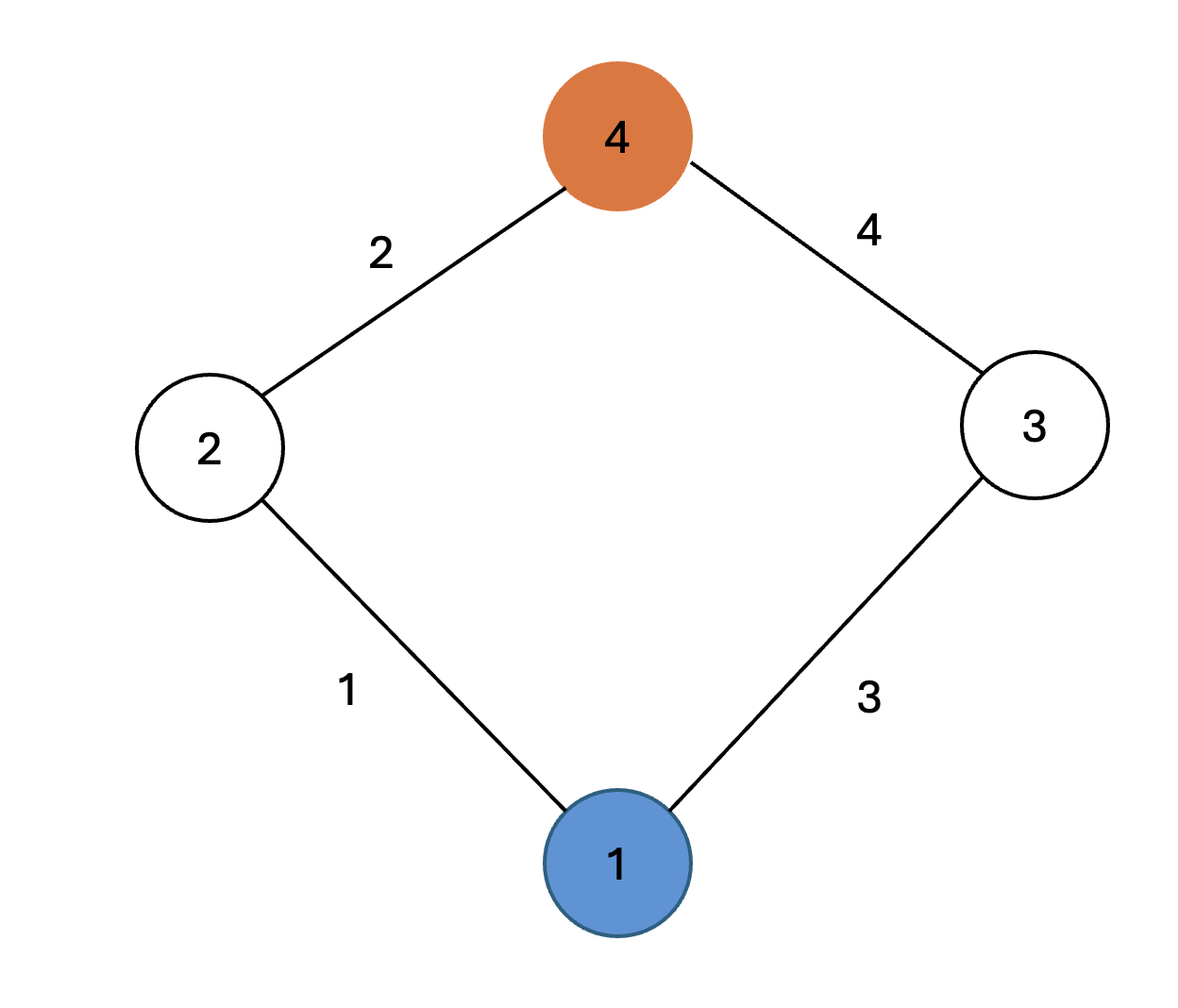 위 그림에서 파란색 노드 1번이 출발 지점이고, 주황색 노드 4번이 도착지점입니다.