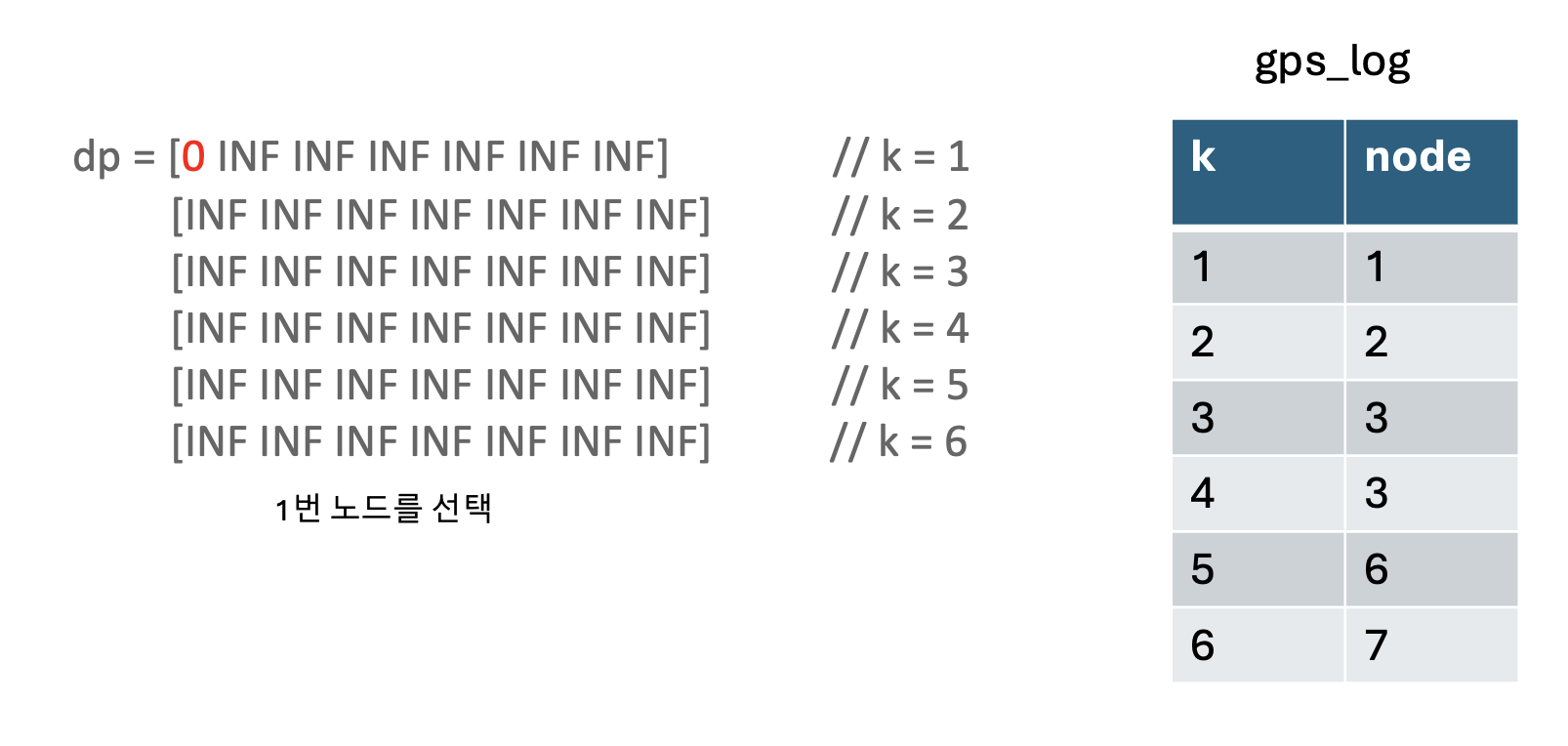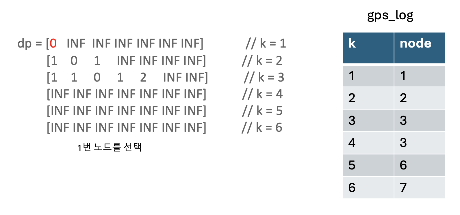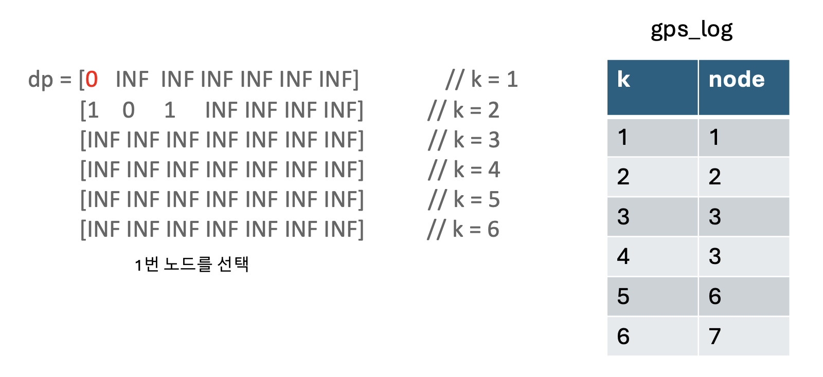 그래프를 활용하여 dp에서 INF를 제외한 노드에서 서로 연결되어 있는 노드를 차례대로 뽑아가며 gps_log와 비교하며 다음 경로의 노드에 대해서 필요한 최소 수정 횟수를 카운트하면서 dp의 내용을 수정해주면 됩니다. 그림으로 설명하겠습니다.