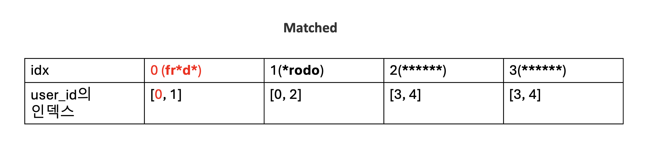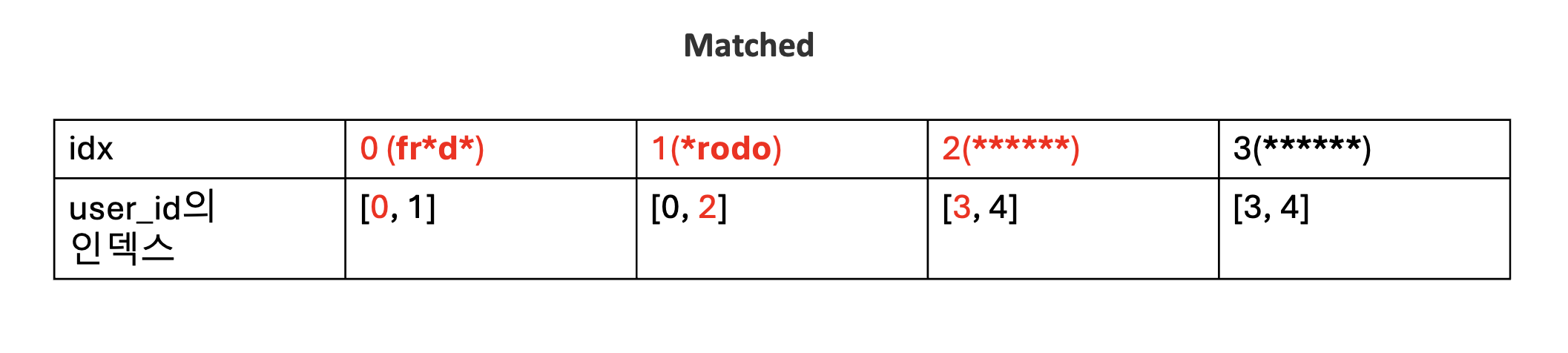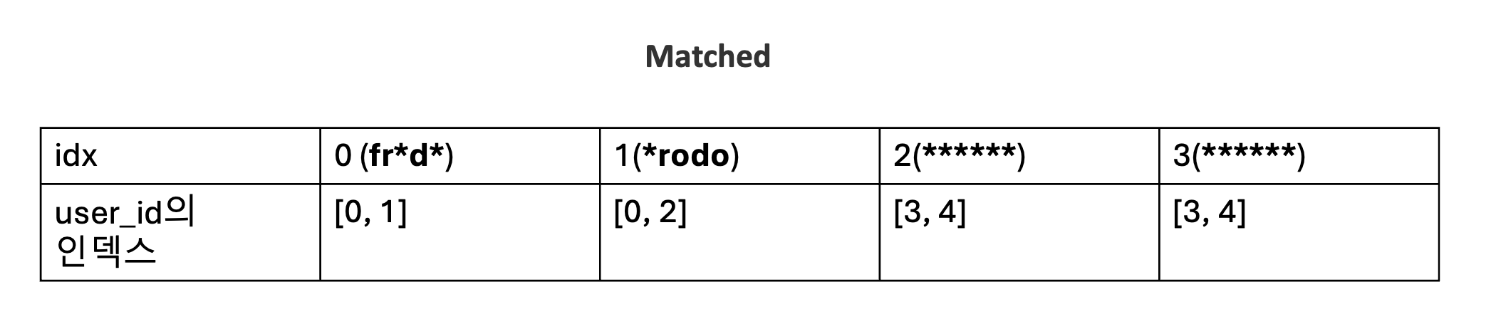 matched의 0번 인덱스에 해당하는 fr*d*의 문자열 패턴은 user_id의 0번 인덱스인 frodo과 fradi에 대응됩니다.